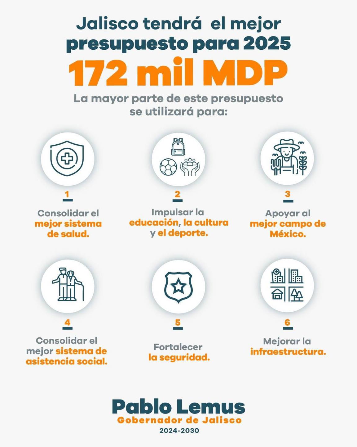 El gobernador electo de Jalisco, Pablo Lemus, destacó que su administración priorizará la seguridad, salud y educación en el presupuesto 2025. Además, se impulsará el deporte, el apoyo al campo y la ampliación de la asistencia social en todo el estado.