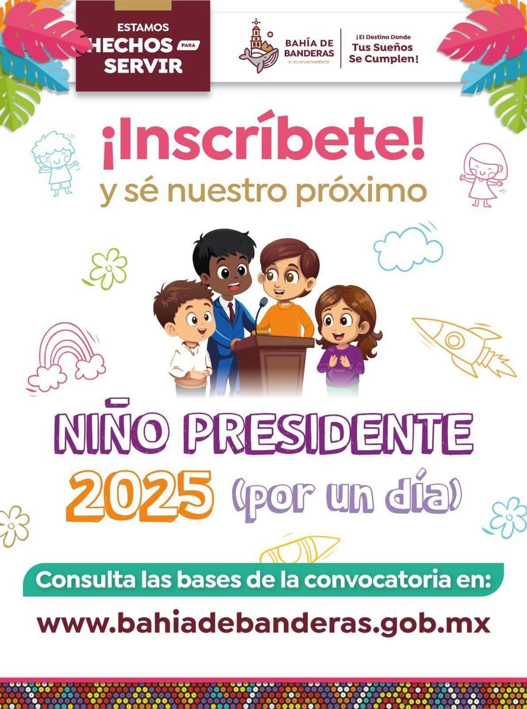 En el #GobiernoDeBahíadeBanderas el cual dirige el Lic. Hector Santana, creemos en el poder y la voz de nuestros niños. Por eso, invitamos a todos los pequeños soñadores a inscribirse en nuestra convocatoria de «Niño Presidente 2025». ![]()