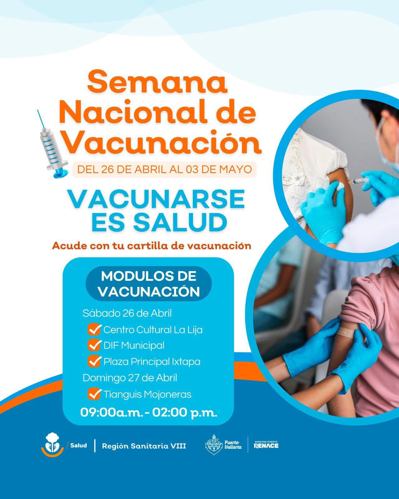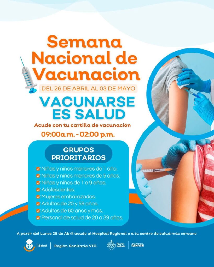 Con el propósito de reforzar la protección contra enfermedades prevenibles y promover el bienestar de las familias, la Octava Región Sanitaria, en coordinación con el Gobierno del Estado de Jalisco y el gobierno del bien que encabeza el alcalde Luis Munguía González, invita a la población de Puerto Vallarta a sumarse a la Semana Nacional de Vacunación 2025, que se llevará a cabo del 26 de abril al 3 de mayo. Durante esta jornada se aplicarán 14 vacunas del esquema básico, así como refuerzos y biológicos complementarios, conforme a los lineamientos de la Secretaría de Salud.