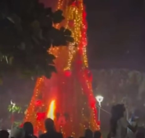 En la plaza principal de San Vicente, el pino municipal del Ayuntamiento por Navidad, se prendió en llamas apenas segundos después de que las autoridades encendieran sus luces.