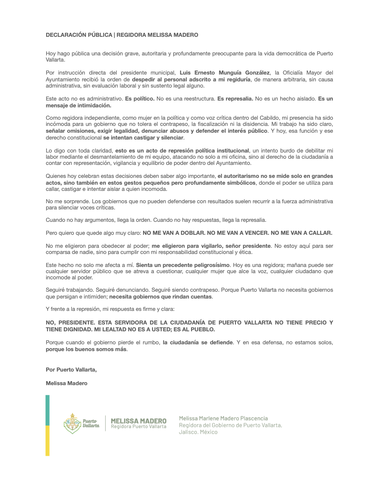 Hoy hago pública una decisión grave, autoritaria y profundamente preocupante para la vida democrática de Puerto Vallarta.