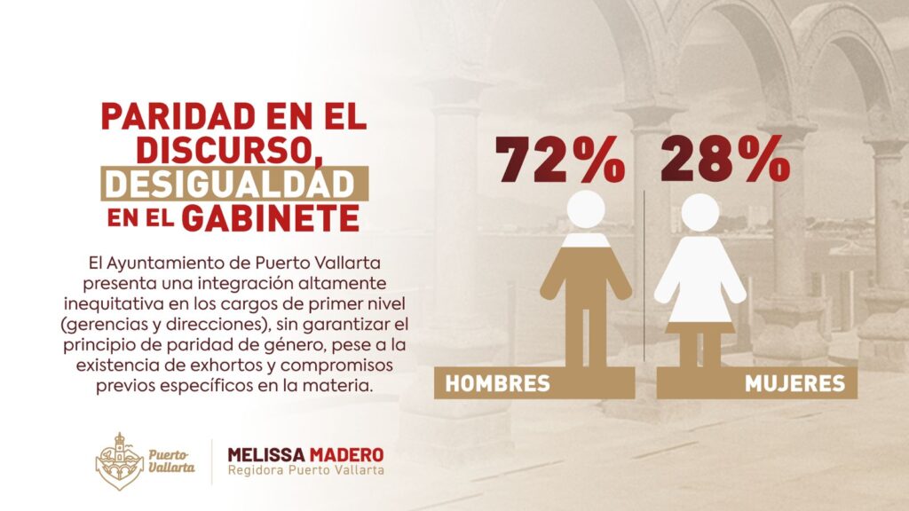 De acuerdo con los datos expuestos, los puestos de mayor nivel dentro del Ayuntamiento de Puerto Vallarta (direcciones y gerencias) mantienen una composición de 72 % hombres y 28 % mujeres, una proporción que, incluso, hasta hace un mes era mayor.